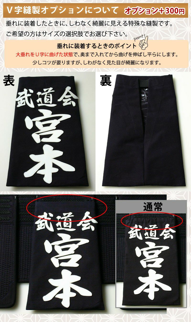 垂れの真ん中にある大垂れにつける袋状のゼッケン(垂れネーム)試合などで使用します。