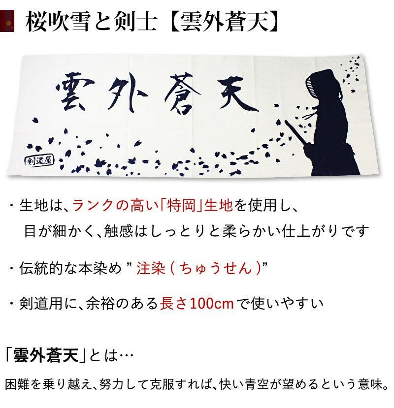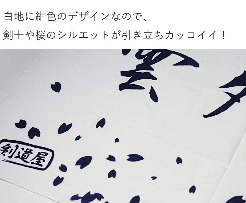 剣道屋オリジナル 面手ぬぐい本格染め●桜吹雪と剣士【雲外蒼天】●白色