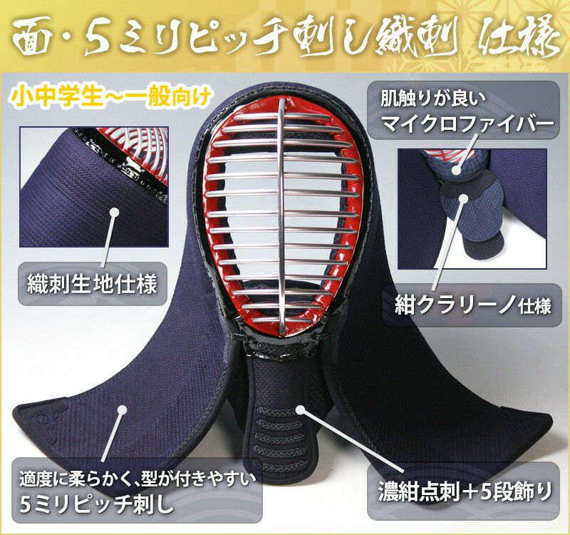 [剣道屋] 小中高生向 防具 面単品 面手拭いプレゼント  5ミリ刺し 剣道 面 [面紐・面乳革付]  (子供~大人サイズ) 小学生 中学生 高校生 初心者 面●5ミリピッチ刺し織刺[Mc] ●説明書