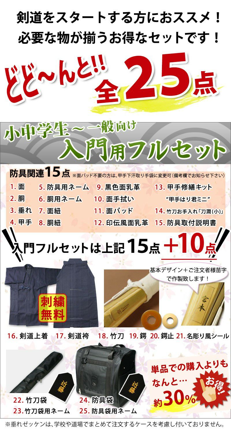 他の画像を見る 小学生~大人までお使いになれる6ミリピッチ刺し剣道防具入門セット。防具袋・面紐・面乳革・胴紐・面手拭はもちろん、剣道着や竹刀もセットに。送料無料 サイズ交換送料無料 【新入生応援】小中高生向 剣道フルセット全25点『楓』[防具一式・剣道着・竹刀・バッグ] ★お好きな面手拭をプレゼント\キャンペーン中/ ★防具サイズ交換送料無料 ●名彫シール ●3年保証書・説明書付 剣道屋特価 ¥ 64,460 税込 詳細を見る お気に入りに登録する
