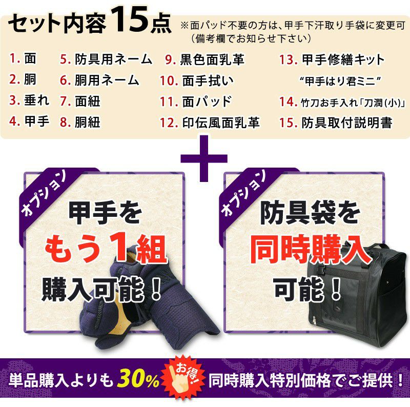 【新入生応援】実戦型 防具一式 全15点『大河』5ミリ刺しJFP PROセット ★面手拭が選べる ★小手3種選択・洗えるor握り重視or本格鹿革 ★防具のサイズ交換は送料無料 ●3年保証書・説明書付