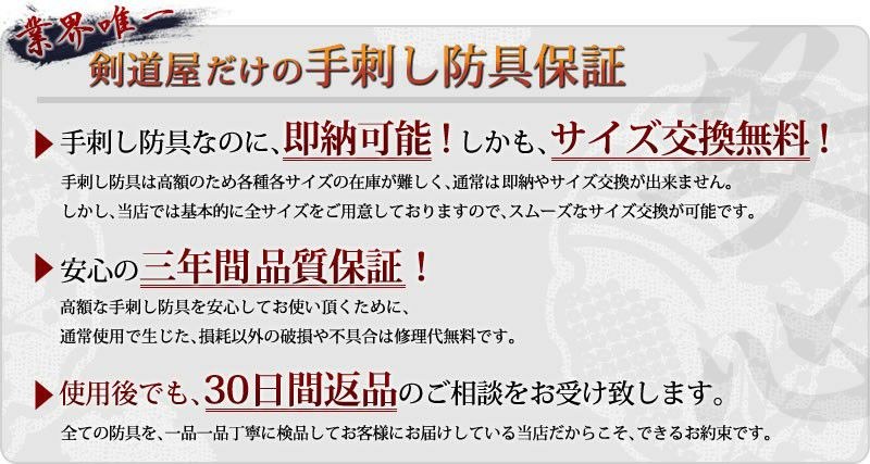 何年か前に1.5分刺しの手刺しを購入させて頂き、(中身は視れませんが)仕立てがとても丁寧で非常に使い易かったこともあり、二度目の八段審査で使用し1次審査を突破しました。 とても使い易いことからボロボロの面を使っていた娘用に今年2月末に2.0分刺しを注文し、4月初めに届きました。1.5分刺しの垂は大垂も厚みが薄かったので少々心配しましたが、2.0分刺しは面、甲手、垂の全てが厚さが十分にあり且つ適度に軟らかかったので安心しました。 娘は痩せているので垂が少々大きかったですが、面は使っているうちに顔に完全フィットする絶妙な大きさでした。 現在は特価の様ですが、正規値段でも考えられないとても良い手刺し防具(剣道具)だと思います。