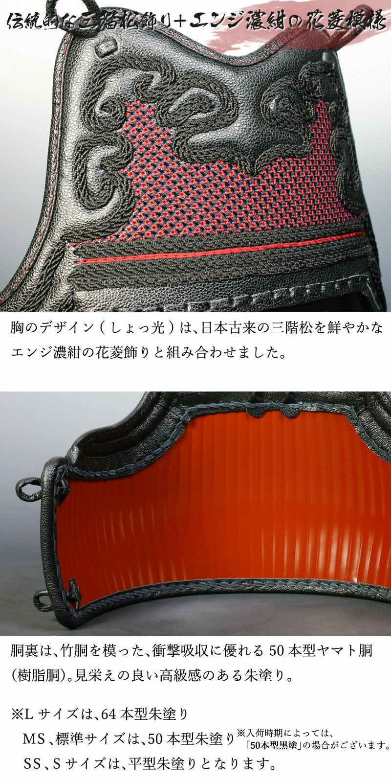 [剣道屋] 胴単品 三階松飾り/エンジ白花菱刺 50本胴裏朱塗 (子供~大人サイズ) [胴紐・ネーム付] 黒胴●花菱・エンジ白 50本型 [Do] ●説明書