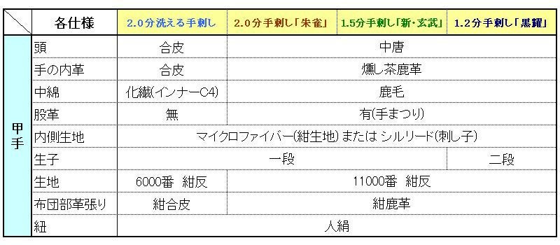 手刺し甲手 仕様比較表