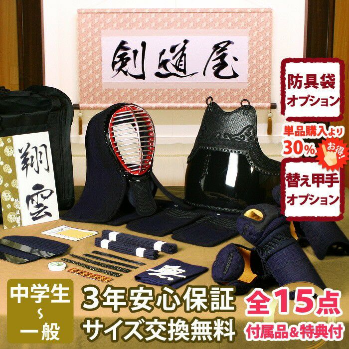 他の画像を見る ピッチ刺しで使い勝手良く、カッコイイ胴胸が特徴の剣道防具セット。甲手2組や刺繍ネームをはじめとする充実の付属品も人気。送料無料・サイズ交換送料無料で安心。 【新入生応援】中高生向防具一式 全15点『八雲』5ミリ刺しJFPスタンダード ★面手拭が選べる ★小手3種選択・洗えるor握り重視or本格鹿革 ★防具のサイズ交換は送料無料 ●3年保証書・説明書付 価格: ¥ 59,400 税込 詳細を見る お気に入りに登録する