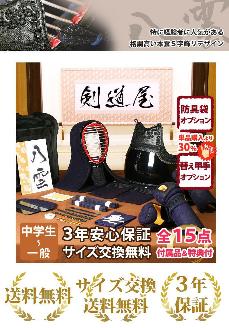 他の画像を見る 【新入生応援】実戦型 防具一式 全15点『八雲』5ミリ刺しJFP PROセット ★面手拭が選べる ★小手3種選択・洗えるor握り重視or本格鹿革 ★防具のサイズ交換は送料無料 ●3年保証書・説明書付 価格: ¥ 68,970 税込 詳細を見る お気に入りに登録する