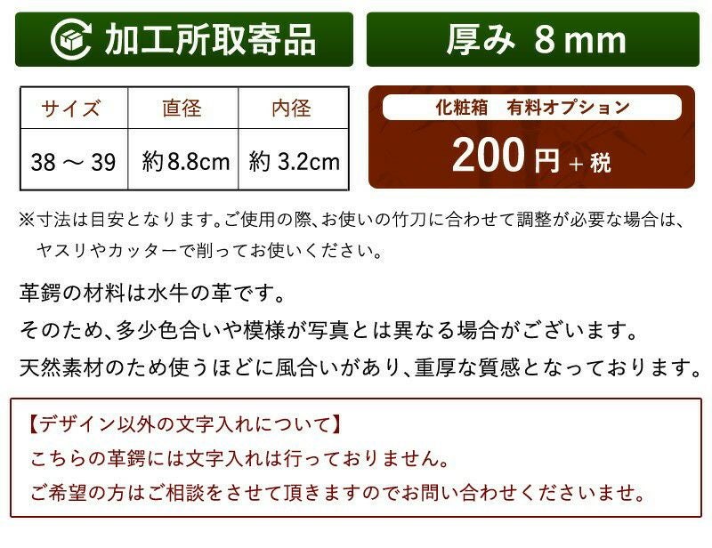【加工所取寄せ品】剣道 竹刀用・革鍔(つば・ツバ) 和風デザイン入り●極上革鍔(●8ミリ厚)38~39サイズ用 贈呈用高級箱(プレゼント)オプション有