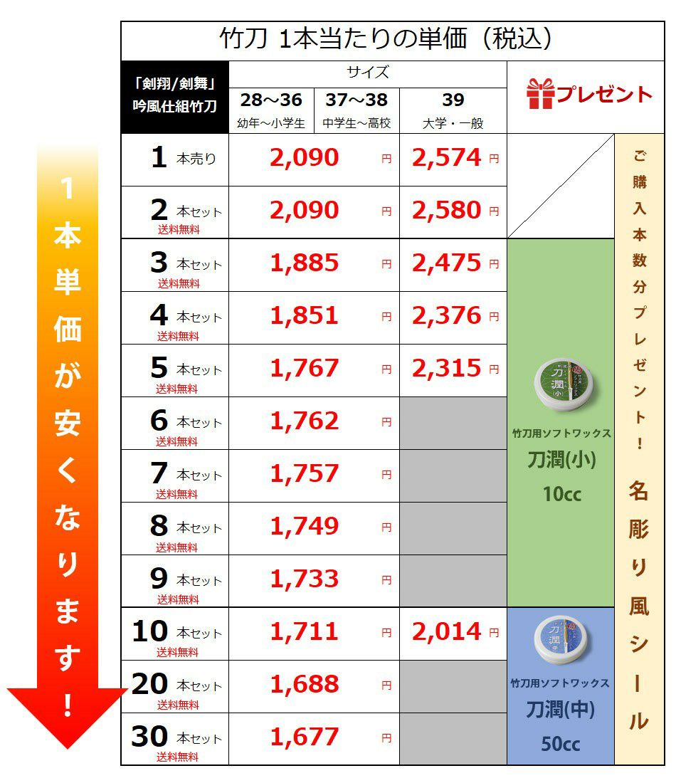 他の画像を見る 【安心交換保証付】剣道 竹刀 一般型吟風仕組竹刀 剣翔・剣舞<SSPシール付> 28~38サイズ 小学生~高校生用 20本セット(中学生 37 高校生 38) 剣道屋特価 ¥ 33,759 税込 詳細を見る お気に入りに登録する