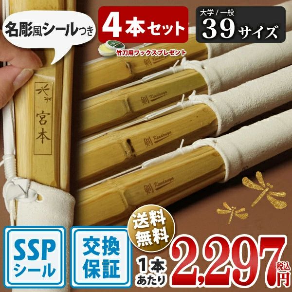 【SSPシール付・安心交換保証付】 4本セット 剣道 竹刀 39サイズ(大学・一般・大人) 床仕組完成品 無銘「剣kendouya」 送料無料 まとめ買い