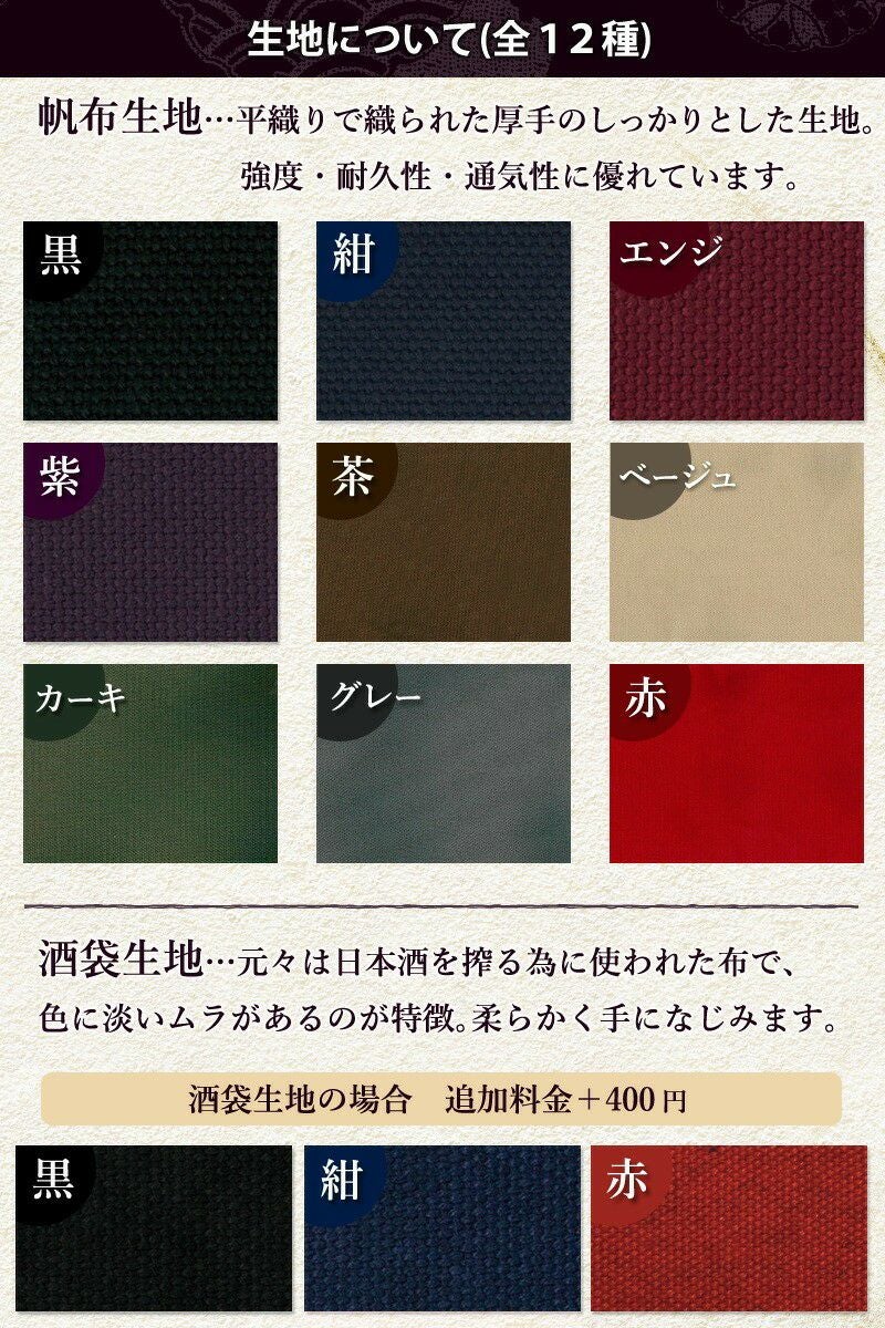 ・生地の種類・色:帆布(黒・紺・エンジ・紫・茶・ベージュ・カーキ・グレー・赤)
