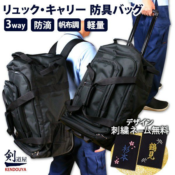 背負えるキャリーバッグ。様々な移動手段に便利な3way防具袋。大容量、収納スペース多数有。刺繍ネーム付&送料無料