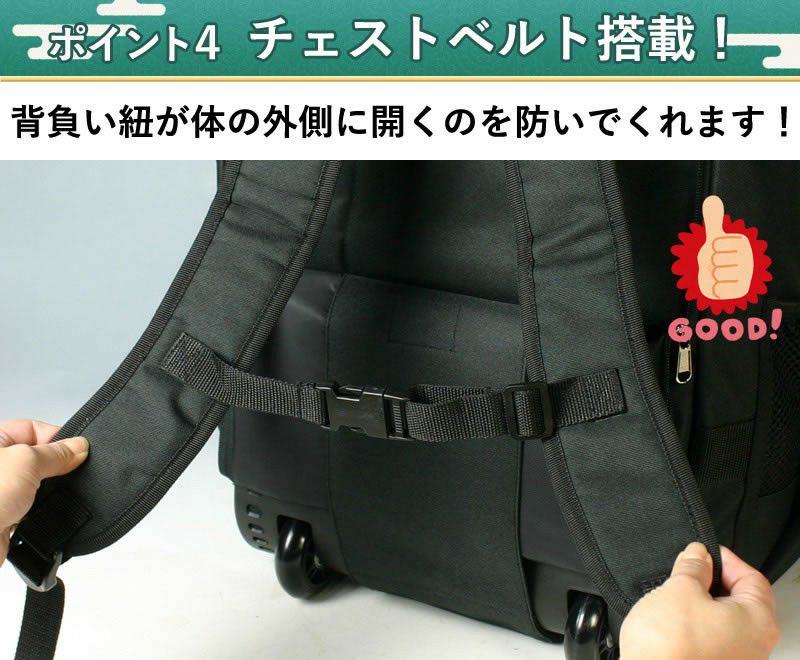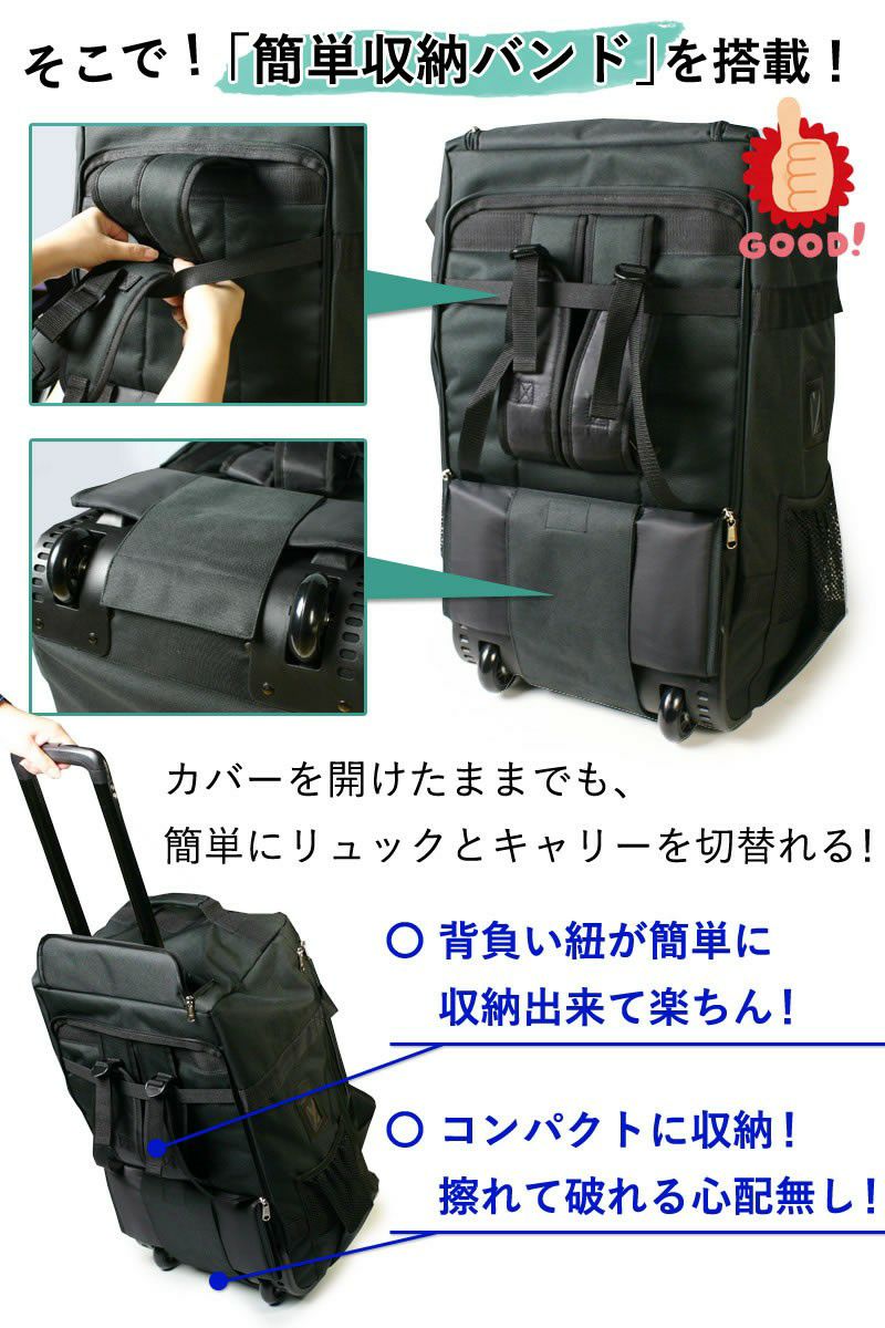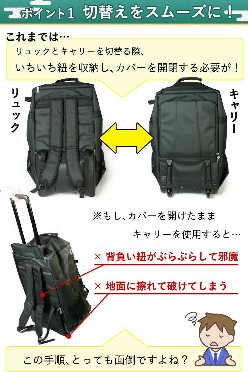 キャスター、手提げ、リュックの3通り使えるのはとても良いですが、1つ気になったのは深さがもうちょっとあれば防具などがしまいやすいなぁ…と思いました。でも、移動がかなり楽になったので買ってよかったって思ってます!