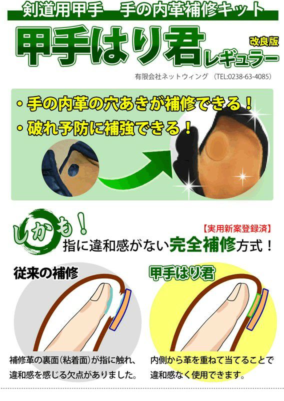 今まで甲手の修理は、武道具店にて修理していましたが、今回甲手はり君の存在を知り、「一度自分でやってみるか。」と購入させていただきました。あまりにも簡単に修理でき、びっくりしております。完成度については、修理後一回しか稽古に使用していませんから分かりませんが、素人の手作業で一回でも稽古に耐えられた事は、大満足です。他にも穴が開き古くなり捨てようかなと思っていた甲手があり、これもチャレンジしようと考えてます。時間と暇のあ剣道愛好家はお勧めです。