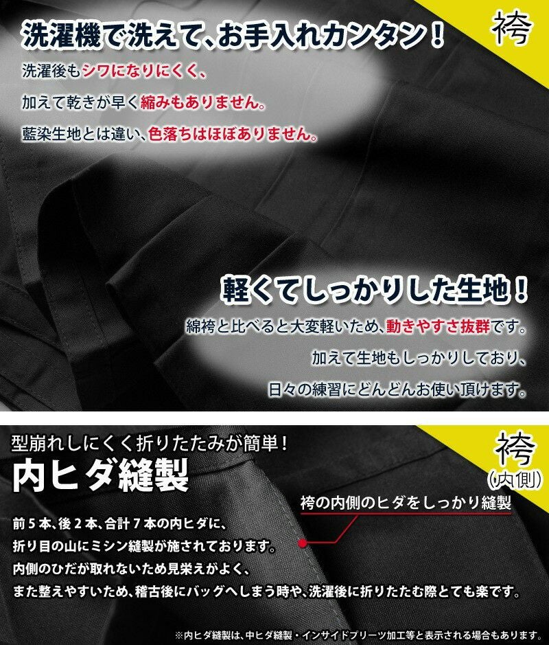 他の画像を見る 剣道屋一番人気の、テトロン剣道袴。内ヒダ縫製加工済みでヒダが取れにくく、扱いやすさ抜群!後ろ上がりスタイルが、足捌きを邪魔しません。上着とのセットも人気。 [剣道屋] 新特製 テトロン剣道袴 紺色 内ヒダ縫製加工 子供~大人用 男女兼用 [剣kenoduyaシリーズ] ★5文字無料+ワンポイント刺繍無料 ★竹刀ワックス付 ●テトロン袴・紺 価格: ¥ 4,390 税込 詳細を見る お気に入りに登録する