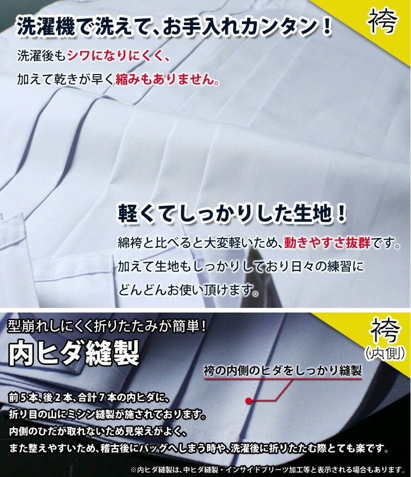 白色上下は小学生の娘が使用してますが、上着も袴もしっかりしており成長でサイズが合わなくなるまで使用し続けることができます。ジャージ剣着は夜洗濯し朝には乾くので、連日の稽古でも一着で対応できます。