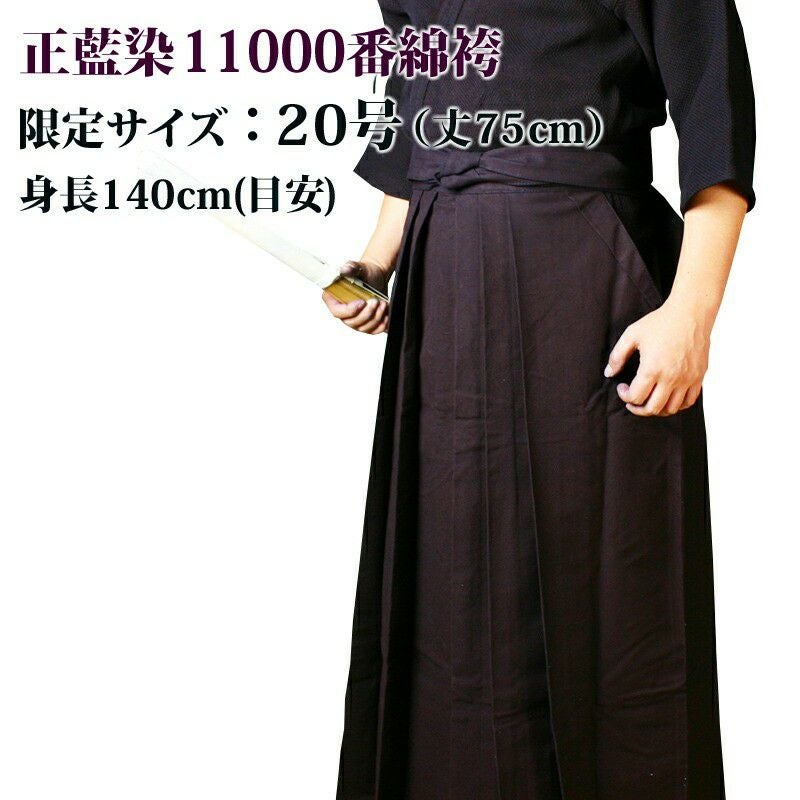 【サイズ限定特価品】 剣道 綿袴 ●正藍染11000番綿袴 ●20号(丈75cm) (内ヒダ縫製加工済み)