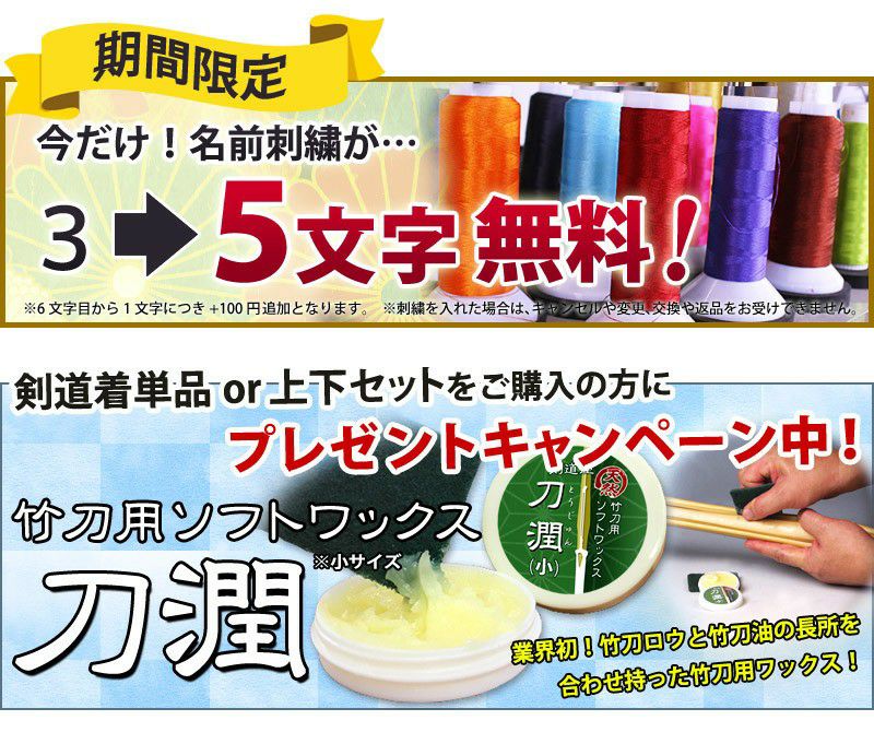他の画像を見る 大人気剣道着セットです!刺繍もそれぞれ5文字無料&送料無料!着心地・動きやすさ・お手入れのしやすさ、全てが揃って、価格も大変リーズナブル。 [剣道屋] 上下セット ●「織刺調・紺ジャージ剣道着+新特製テトロン剣道袴・黒」剣道着セット 子供~大人サイズ ★各5文字無料+ワンポイント刺繍無料 ★オリジナル面手拭プレゼント ★竹刀ワックス付 剣道屋特価 ¥ 7,298 税込 詳細を見る お気に入りに登録する