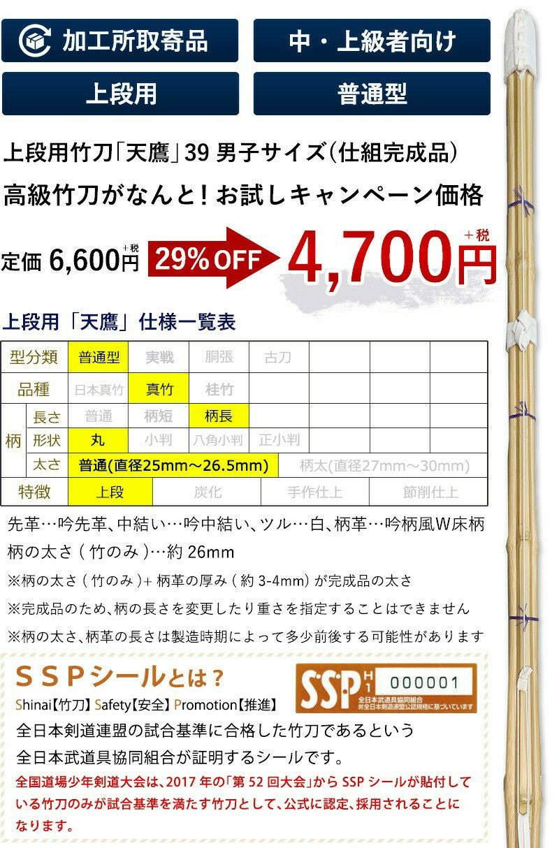 【加工所取寄せ品】剣道 竹刀《●天鷹 謹製》真竹上段用 吟風W床仕組 完成品竹刀 ●39男子サイズ 柄26mm[NSA-9]<SSPシール付>