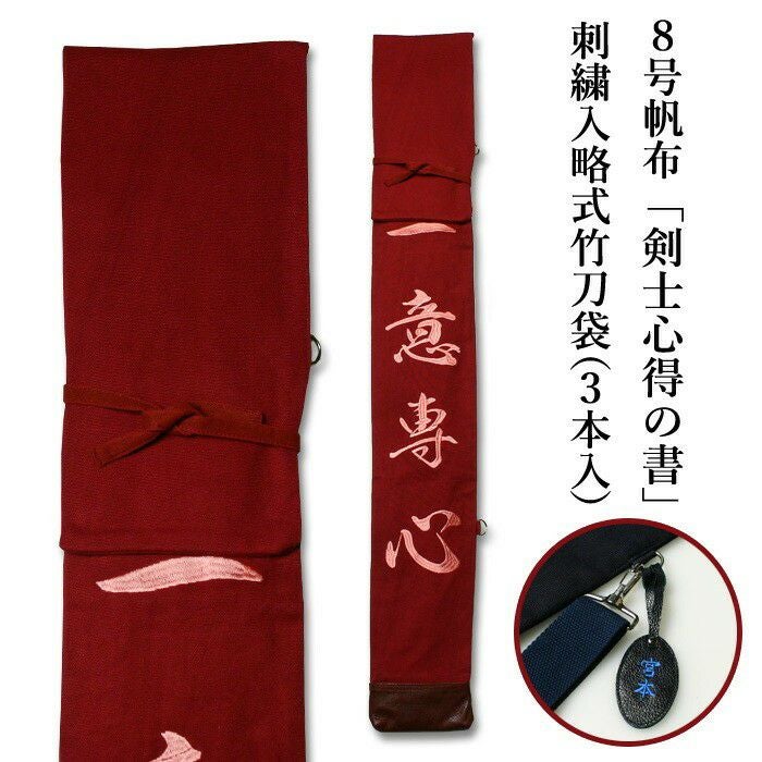 【加工所取寄せ品】 剣道 竹刀袋 ●8号帆布《エンジ生地》「剣士心得の書」刺繍入り略式竹刀袋(3本入)