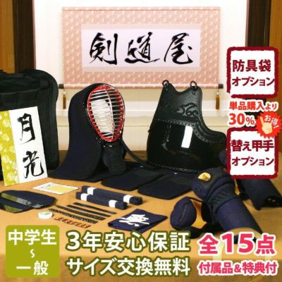 【新入生応援】中高生向防具一式 全15点『月光』5ミリ刺しJFPスタンダード ★面手拭が選べる ★小手3種選択・洗えるor握り重視or本格鹿革 ★防具のサイズ交換は送料無料 ●3年保証書・説明書付のレビュー