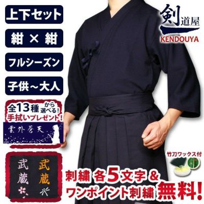 [剣道屋] 紺色 上下セット ●「織刺調・紺ジャージ剣道着+新特製テトロン剣道袴・紺」剣道着セット 子供~大人サイズ ★各5文字無料+ワンポイント刺繍無料 ★オリジナル面手拭プレゼント ★竹刀ワックス付のレビュー