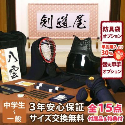 【新入生応援】中高生向防具一式 全15点『八雲』5ミリ刺しJFPスタンダード ★面手拭が選べる ★小手3種選択・洗えるor握り重視or本格鹿革 ★防具のサイズ交換は送料無料 ●3年保証書・説明書付のレビュー