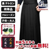 [剣道屋] 新特製 テトロン剣道袴 黒色 内ヒダ縫製加工 子供~大人用 男女兼用 [剣kenoduyaシリーズ] ★5文字無料+ワンポイント刺繍無料 ★竹刀ワックス付 ●テトロン袴・黒