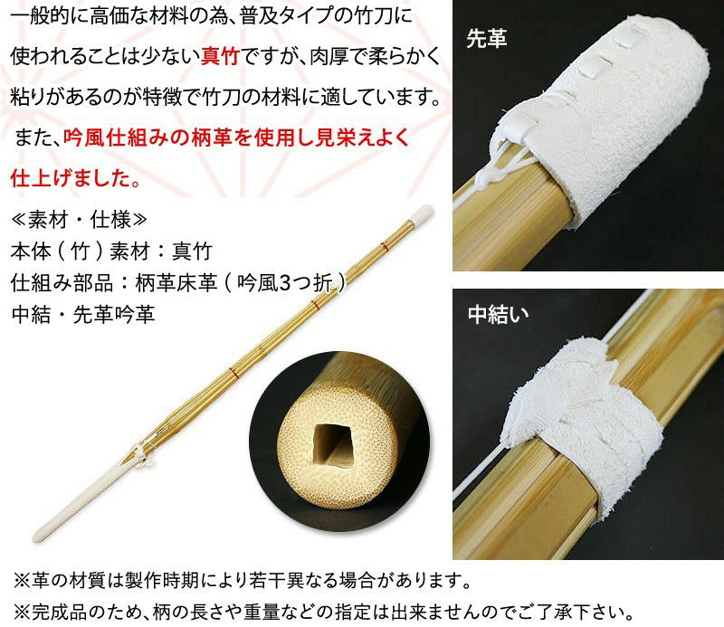 他の画像を見る 送料無料!良質な真竹で製作した竹刀です。部品も普及型よりワンランク上の質感があります。安心の全日本剣道連盟規格適合品。練習や試合でバッチリ使えます。 【安心交換保証付】「真龍」<SSPシール付>真竹吟風仕組み完成竹刀 30~36サイズ 12本セット 剣道屋特価 ¥ 23,793 税込 詳細を見る お気に入りに登録する