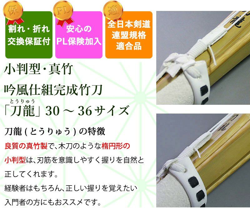 送料無料!竹刀の握りが正しくなると言われている「小判型」の竹刀。良質の真竹製で、価格もリーズナブルで大人気!全日本剣道連盟規格適合品で、試合にも使えます。 【安心交換保証付】剣道 竹刀「刀龍」<SSPシール付>両手小判型・真竹吟風仕組み完成竹刀 30~36サイズ 10本セット 剣道屋特価 ¥ 21,263 税込 詳細を見る お気に入りに登録する