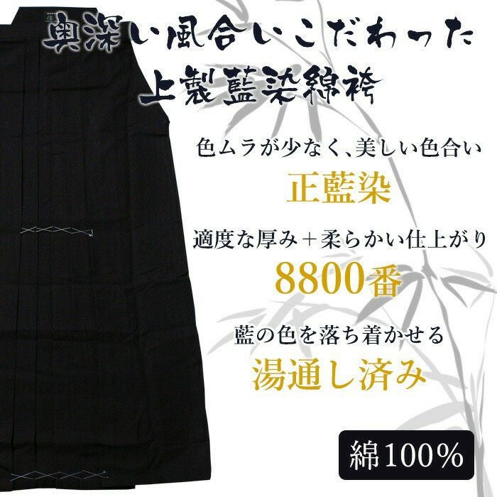 他の画像を見る 国産ならではの美しい仕立て。藍染 綿袴 8800番しっかりとした腰のある生地を使用しているため、柔らかい仕上がり。湯通し済みなので藍色を落ち着かせています。 【加工所取寄せ品】 剣道 綿袴 正藍染 ●[禅]特上袴8800番綿袴<銀印> 定価 ¥ 29,900 のところ 価格: ¥ 21,450 税込 詳細を見る お気に入りに登録する