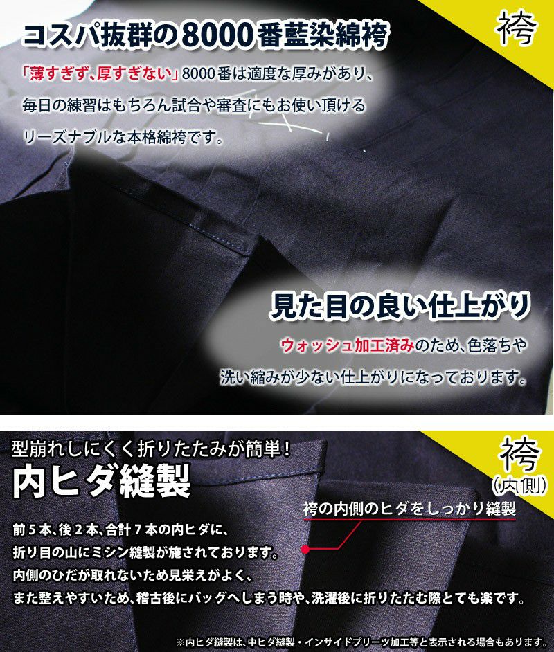 他の画像を見る 中高生に人気の綿袴!お手頃価格の本格8000番綿袴。 内ヒダ縫製加工済みでヒダが取れにくく、扱いやすさ抜群!送料&刺繍5文字無料でお得! [剣道屋] 正藍染 8000番 剣道 綿袴 審査や試合に最適 [剣kenoduyaシリーズ] ★刺繍5文字無料 ★竹刀ワックス付 ●8000番綿袴(内ヒダ縫製加工・ウォッシュ加工) 価格: ¥ 8,990 税込 詳細を見る お気に入りに登録する